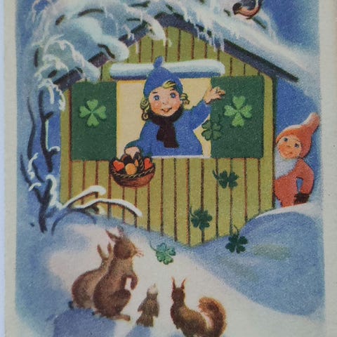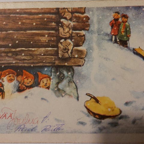 Jouluaiheisia postikortteja on tässä tarjolla euron hintaan kappale. Postimaksu kirjeessä on 2,75 euroa 50 grammaan asti. Sitä painavampi kirje maksaa 5,50 euroa.