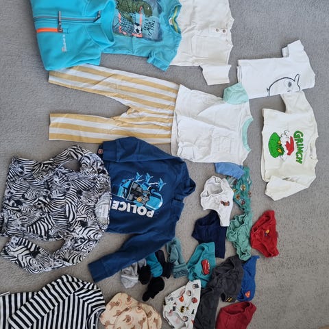 Vaatepakettiin sisältyy t-paitoja, pitkähihaisia, collegepaitoja, housuja ja sukkahousut.