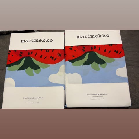 Marimekko mustapippuri pussilakanat valkonen pohja 2kpl pussilakanat on 150*210cm ja tyynyliinat 50*60cm voin lähettääkin