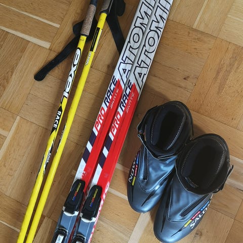Peltonen Supra Cosmic -hiihtosukset luisteluhiihtoon. Suksissa Salomon SNS -sidejärjestelmä. Mukaan kuuluu Fischer -hiihtosauvat, joissa alumiinirunko. Sukset 145cm ja sauvat 115cm.