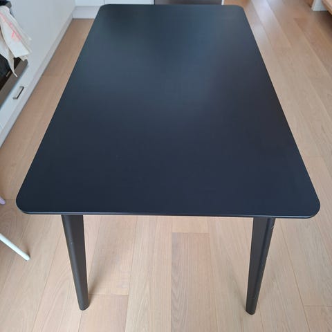 Ikea Lisabo pöytä, musta väri. Pöydän koko on 140x78 cm, ja se on suunniteltu moderniin sisustukseen. Pöydässä on neljä suoraa jalkaa.