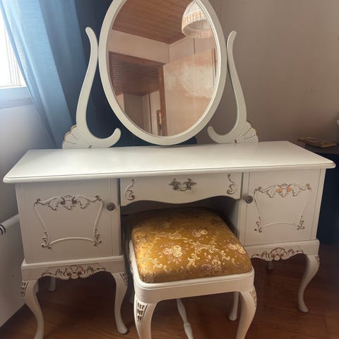 Vintage tyyppinen kampaus pöytä. Hyvässä kunnossa, ehjä. Laatikostot ehjiä, mutta maalia irronnut yhden laatikoston pinnalta. Vain nouto Juvan Luomalasta