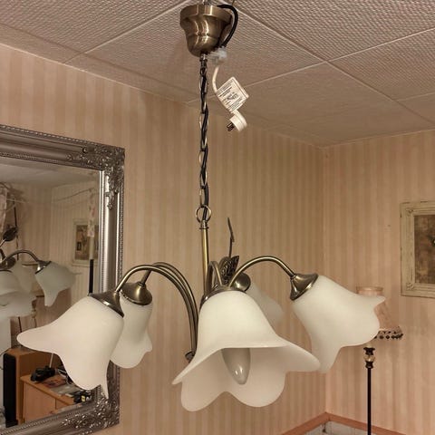 Kolme erilaista valkoista lasista kattovalaisinta messinkisillä yksityiskohdilla. Ensimmäisessä valaisimessa on pyöreä, opaalilasisesta kupusta koostuva varjostin ja suora ripustusputki. Toisessa valaisimessa on viisi käsivartta ja sylinterimäiset lasivarjostimet, jotka jakavat valon useampaan suuntaan. Kolmas valaisin on muodoltaan leveä ja matala, opaalilasinen kupu roikkuu ketjulla kiinnitettynä kattoon. En lähetä. Kulkeutuu Sastamala Tampere välillä. Kaikki kerralla 150e