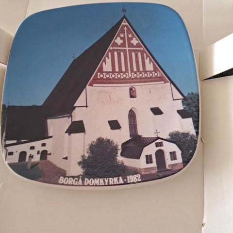 Arabia Borgå Domkyrka 1982 seinälautanen, jossa on Porvoon tuomiokirkkoa esittävä kuvitus. Lautanen on neliönmuotoinen pyöristetyin kulmin ja siinä on kiiltävä lasitus. Seinäkiinnityslenkki. Sopii keräilyesineeksi tai seinäkoristeeksi. Koko 20 x 20 cm. Paino 600 g.