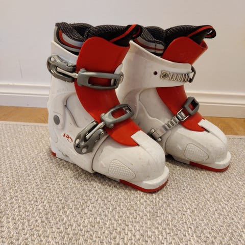 Head Raptor lasten laskettelumonot. Väri musta harmailla ja punaisilla yksityiskohdilla. Kengässä on yksi solkikiristys ja takaa avautuva malli, joka helpottaa pukemista ja riisumista. Pohjassa merkintä 170–185, joka viittaa noin 185 mm sisäpituuteen. Monot soveltuvat lasten alppihiihtoon ja laskettelurinteeseen.