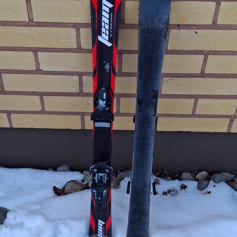 Lasten laskettelusuksi, päällä käytön jälkiä, pohjat vaativat huoltoa.