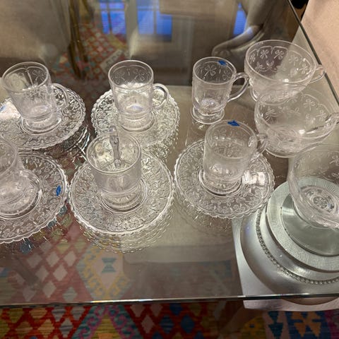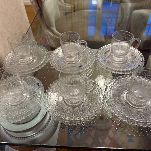 Iittala lasiset jalalliset jälkiruokakulhot kirkasta lasia. Kulhoissa on kohokuvioitu koristekuvio ja pyöreä jalkaosa. Soveltuvat esimerkiksi jäätelön, jälkiruokien tai pienten annosten tarjoiluun. Myydään kuvissa näkyvänä settinä.3 Nuutajärven tarra 1 Arabian tarra 2 Iittala.Nouto Inkeroinen.