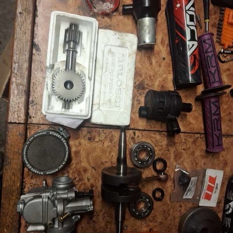 Tekniikka, 80cc a9 nokalla ja isoventtiilikannella, ja vakio kaasarilla 200km ajettu, levytakajarrusetti ja tuplaiskarit mukaan, säädöissä ja täysin toimiva, 150€