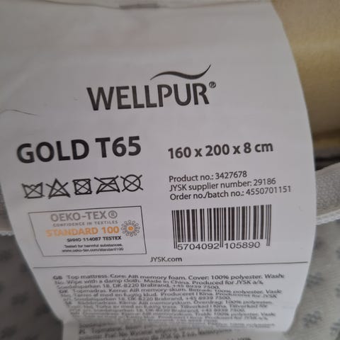 Jysk Wellpur vaahtomuovipatja. Patja on vaahtomuovia ja väriltään valkoinen. Päällinen on kuvioitu ja siinä on vetoketju, mikä helpottaa irrottamista pesua varten.