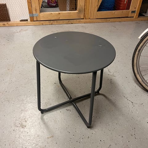 Valkoiseksi maalattu kaapelikelapöytä. Halkaisija 63cm ja korkeus 41cm