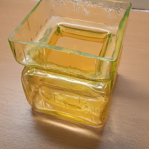 Riihimäen lasi, Aitanlukko maljakko, väri Amber. Suunnittelia Helena Tynell. Pienen pieni noin 1 mm kokoinen roso suuaukon sisäpinnalla, muuten siisti ja naarmuton.