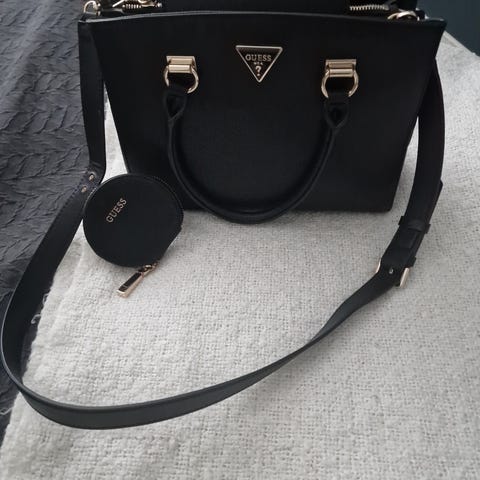 Guess olkalaukku naisille. Laukku on valmistettu tekonahkasta ja siinä on tikattu pinta sekä niittikoristelu. Olkahihna koostuu ketjusta ja tekonahkaisesta osasta, mikä helpottaa kantamista olalla. Sopii arki- ja juhlakäyttöön pienten henkilökohtaisten tavaroiden, kuten puhelimen, lompakon ja avainten kuljettamiseen.
