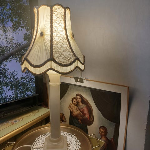 Lampunkanta E27, max 60W Led lamppu mukaan. Sähköjohto uusittu, joten sopii maadoitettuun pistorasiaan. Painonappi katkaisin.