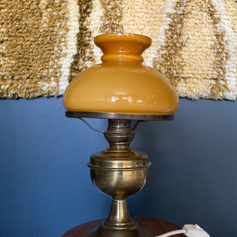 Runko messinkiä ja täysin moitteeton vaalea kangasvarjostin.