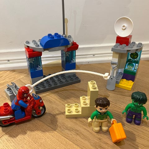 Myydään Lego Duplo Marvel rakennusleikki, jossa on Spider-Man -teemainen rakennelma ja moottoripyörä. Settiin kuuluu erilaisia Duplo-palikoita, Spider-Man -aiheisia osia, moottoripyörä sekä lisävarusteita, kuten hämähäkinverkko ja työkalu. Mukana tuleva lehtinen tallessa, mutta hieman rähjääntynyt.