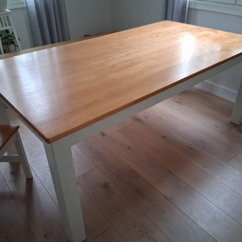 Suomalaista käsityötä, puusepän valmistama ruokapöytä. Kansi on täyttä puuta. Pöytä on ollut viisi vuotta käytössä, joten jotain käytön jälkiä löytyy, mutta yleisilme on edelleen hyvin siisti. Pöydän jalan alle laitettiin valkoinen lisäpohja, jotta pöytä olisi vielä hieman tukevampi lapsiperheessä, mutta pohjan saa halutessaan myös otettua irti. Kuljetus on mahdollista lisähinnasta!