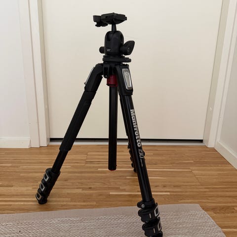 Benron erittäin kevyt hiilikuitu+magnesium kamerajalusta Manfrotto 496RC2 kuulapäällä. Sopii todella hyvin matkakäyttöön, painoa reilun kilon kokonaisuudella.