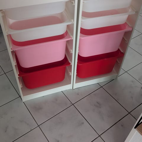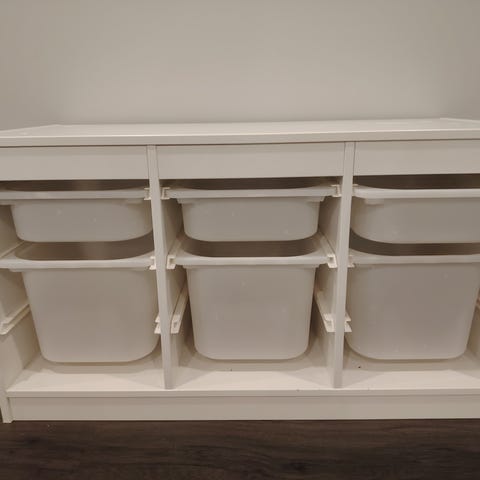 IKEA Trofast säilytyskaluste muoviastioilla, mänty ja valkoinen