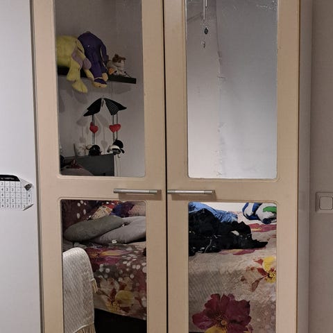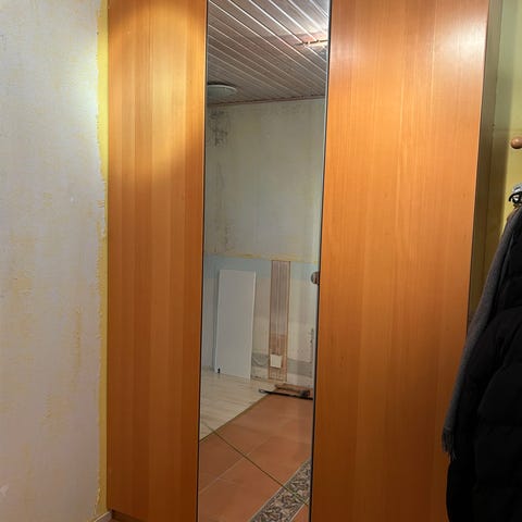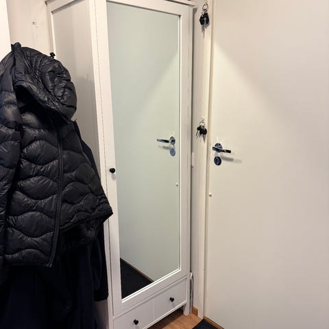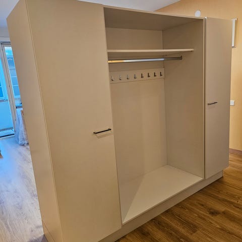 Myydään hyväkuntoinen (v. 2022) vaatekaapisto/ eteisen kaapisto, jossa oikealla leveä tankokaappi (peiliovien takana), keskellä hyllykaappi, ja vasemmalla siivouskaappi (saa myös irralleen muusta kaapistosta). Sokkelin takana säätöjalat. Ovissa olevat peilit tulevat mukaan.