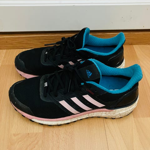 Adidaksen hyväkuntoiset ja ehjät lenkkarit. Kokomerkintä 40, vastaa reilua 39:ää (pohjallinen kantakupista kärkeen 25,5 cm). Kimmoisat ja lestiltään reilut. Pitävä Continental-pohja. Kengissä on aina pidetty irtopohjallisia. Kenkiä käyttäneellä lapsella ei ole jalkojen asentovirheitä.