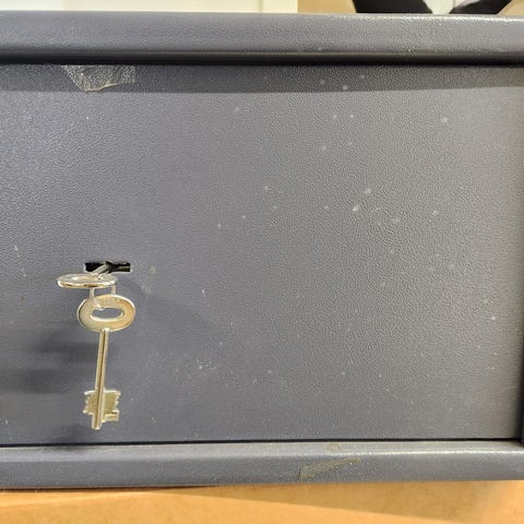 -Kassakaappi on väriltään harmaa ja siinä on avainlukitus.
