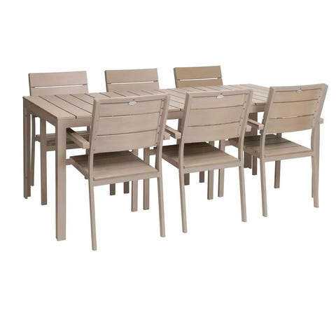 Suvi-ruokailukalusteilla teet terassistasi viihtyisän ajanviettopaikan perheelle ja ystäville. Tässä ryhmässä Suvi Cafe -ruokapöytä on yhdistetty Suvi -malliston Aintwood -tuolien kanssa. Säänkestävät kalusteet ovat hoitovapaita ja niiden laatu on ensiluokkaista ja kestävää. Suvi Aintwood -tuolit ovat pinottavia, mikä helpottaa talvisäilytystä, kun tuolit saa varastoitua pienempään tilaan.