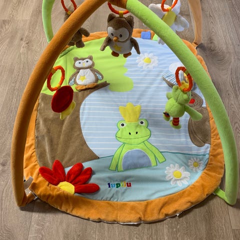 Leikkimatto lelukaarella, mukaan kolme lelua. Yksi pupu hävinnyt johonkin matkan varrella. Ehjä ja siisti käytetty kunto, pesusta tullutta nukkaa joissain kohdin. Hajusteeton pesu, ei lemmikkejä kotona.