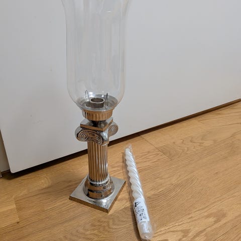 Kullanvärinen kynttilänjalka. Kynttilänjalassa on koristeellinen, pyöreä jalusta ja kapea varsi. Materiaalina on metallinen, kiiltävä pinta, jossa on kaiverrettuja koristekuvioita jalustassa. Sopii tavalliselle kruunukynttilälle tai vastaavankokoiselle kynttilälle.