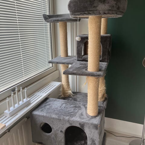 Beige monitasoinen raapimispuu kissalle. Useita tasoja kiipeilyyn ja lepoon sekä suljettu koppi, jonka päällä pyöreä aukko. Tolpat päällystetty narulla raapimista varten. Pohjatasossa ja kopin päällä tassukuviointi. Sopii sisäkissoille kiipeily- ja lepopaikaksi.