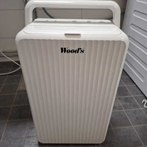 Wood’s MRD12 ilmankuivain. Sähköinen ilmankuivain kodin tiloihin, varustettu kantokahvalla ja ohjauspaneelilla laitteen yläosassa.
