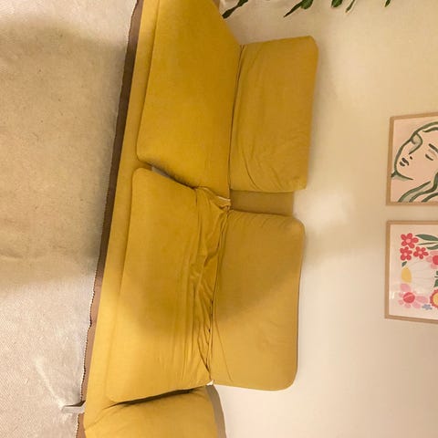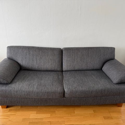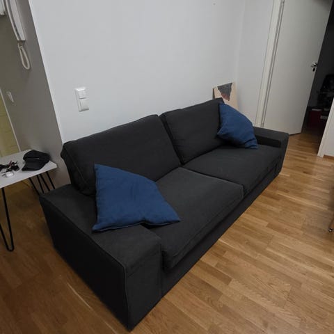 Annetaan sohva. Sohva on tyydyttävässä kunnossa. Likaa ja kissan raapimia jälkiä.