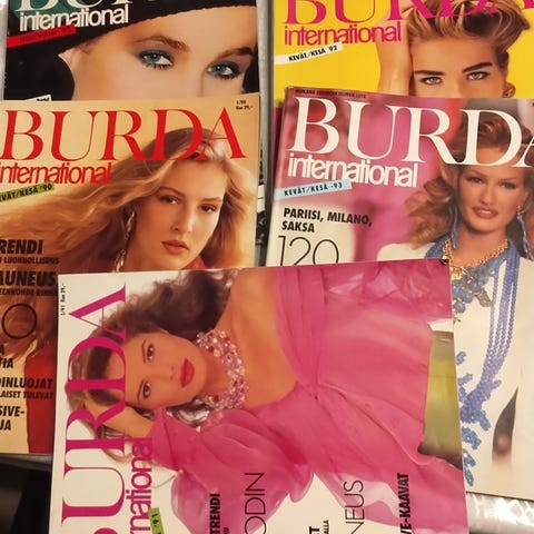 Burda International muotilehti, yhteensä 2 kappaletta. Lehdissä muotia ja kaavoja, muun muassa vuoden 1987 muotiaiheita. Mukana kaava-arkkeja vaatteiden ompeluun. Sopii kaavoituksen ja ompelun lähdemateriaaliksi sekä muodin ja lehtien keräilyyn.