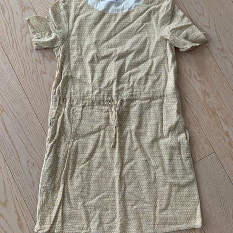 puuvillamekko koossa 34. Sisäänommeltu alushame, selässä vetoketju, sivuissa taskut. Pituus vähän polven yläpuolelle, 3/4 hihat.