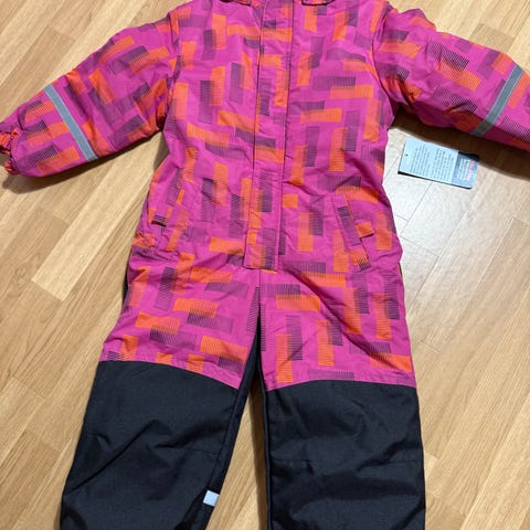 Lasten haalari, koko 104, unisex-malli. Haalarissa on kirjava kuosi vaaleanpunaisen, harmaan ja beigen sävyissä sekä täpliä. Edessä on pitkä vetoketju helpottamassa pukemista. Hupullinen malli, jossa on pitkät hihat ja lahkeet sekä resorit hihoissa ja lahkeissa. Sopii ulkoiluun lapselle, joka käyttää kokoa 104.