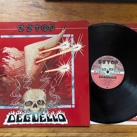 Levy siisti, naarmuton ja hyvin soiva NM- ja kansi VG+ vähäistä reuna kulumaa. ZZ Top liite/mainos mukana.