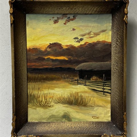 Talvista pihamaisemaa ja hankia kuvaava maalaus auringonlaskun värjätessä taivaan. Hyvä kunto, koko kehyksineen 66,5 x 51,5 cm.
