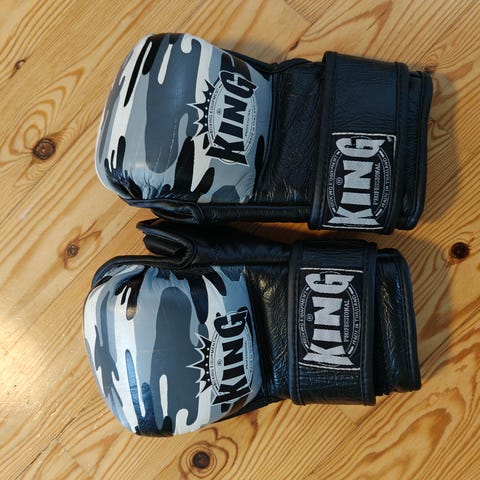 M-kokoiset King-merkkiset vapaaotteluhanskat. Leveä tarranauhakiinnitys.