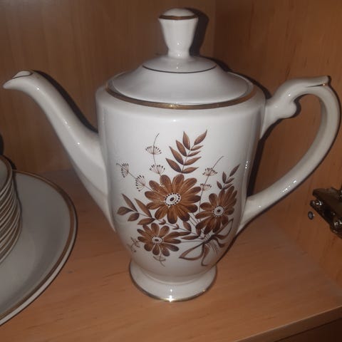 Vanhaa Arabiaa, 1940-luku, Olga Osol, Finlandia AX, myydään kokonaisuutena kahvikaadin, kermakko ja sokerikko, 8 kpl kahvikuppeja. Ruskea kukka-aihe, posliinia. Vain nouto.