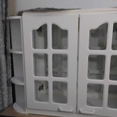 Kolmeosainen kirjahylly 80-luvulta. Vitriini, baarikaappi, valot yläkehyksessä.