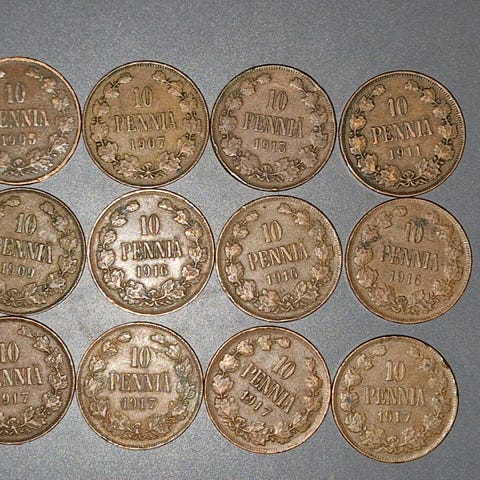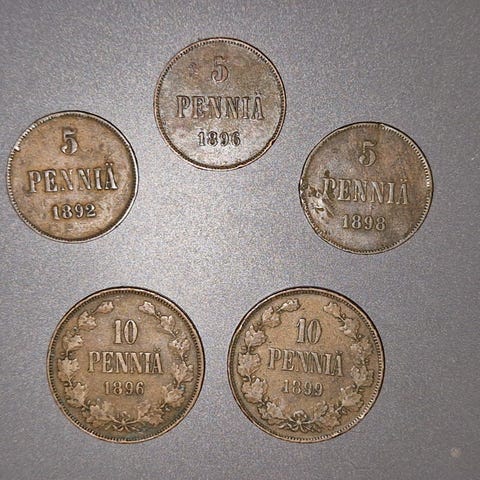5 pennin kolikoita vuosilta 1905-1917. 24 kpl yhteensä 20 €