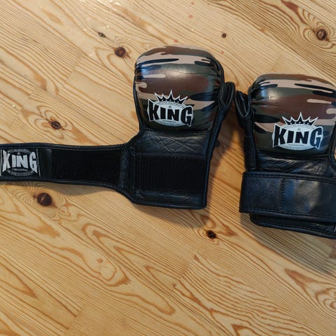 M-kokoiset King-merkkiset vapaaotteluhanskat. Leveä tarranauhakiinnitys.