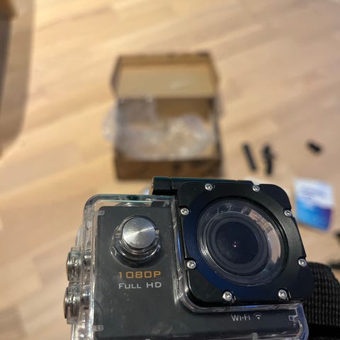 Action-kamera. Mukana vedenpitävä kotelo, erilaisia kiinnitysosia, hihnakiinnikkeet (kypärä & olkapäälle tulevat ”valjaat”) sekä muita tarvikkeita. Kamerassa etunäyttö ja takanäyttö, sivussa liitännät muistikortille ja kaapeleille. Soveltuu esimerkiksi urheilu- ja ulkoilukuvaukseen sekä muuhun toiminnan taltiointiin.