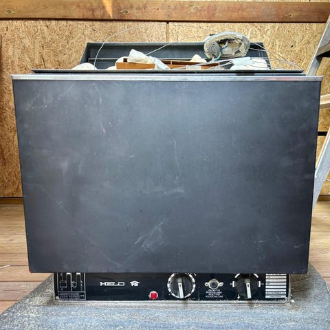 Helo sähkökiuas musta. Tarkemmat tiedot löytyvät kiukaan tyyppikilvestä.