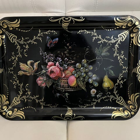 Visakoivuinen lakattu vanha tarjotin. Halkaisija 25 cm. Kaunis lakkapinta. Normaalia käyttökulumaa.