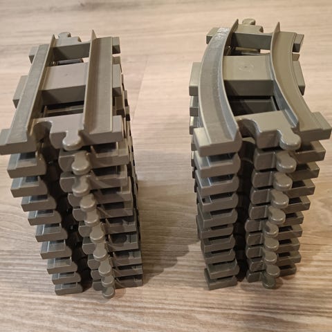 Myydään hyvässä leikityssä kunnossa olevat Lego Duplo junaradan ratapalat yhteensä 5kpl. Nämä on tummempia ratapaloja eli luultavasti vanhempaa tuotantoa. Normaalia käytönjälkeä paloissa on eli naarmuja, yhdessä palassa syvempi naarmu mutta ei vaikuta junan kulkuun. Kaikki palat on kuitenkin ehjiä.