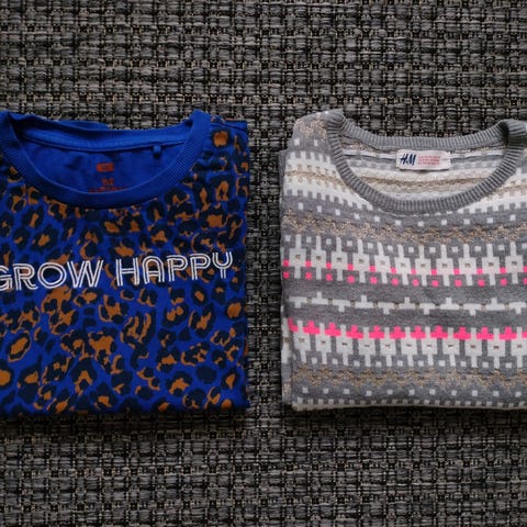 Siistejä pitkähihaisia paitoja kooltaan n. 128 cm (yliruksittu paita kokoa 134-140 eikä siis kuulu tähän kokopakettiin). Kaksi napitettavaa neulepaitaa ja kaksi pitkähihaista. Siistejä paitoja seuraavalle neitoselle.