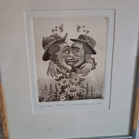 Pekka Vuoren grafiikka v. -98 "Philharmony sisters". Koko kehyksineen (mattahopea metalli) 50 x 60 cm, teos 47 x 36 cm. Säilytetty sisätiloissa, ollut vain n 3 kk seinällä. Merkinnät 150 / 175. Vain nouto, toriviesti