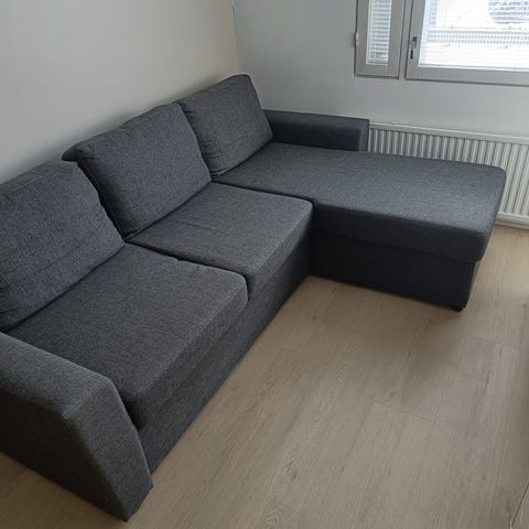 Divaanisohva, lisävuode sekä säilytyslaatikko.