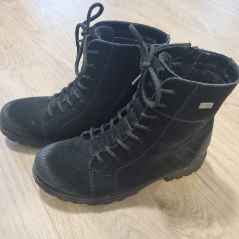 Lämpimällä villavuorella olevat juuri nahanhoitoaineella käsitellyt nahkaiset Rieker maiharit koko 38. Sivussa vetoketjut. Huiput kengät, mutta itselle harmillisesti liian pienet. Nouto Ylämyllyltä. Postit ostajalle. Koiratalous. MMM.