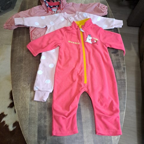 Yhdellä lapsella käytössä olleet hellehaalarit. Keltaisessa järjäymää polvissa muuten moitteettomat haalarit. Pesty miedontuoksuisella pesuaineella, lemmikki koti!
